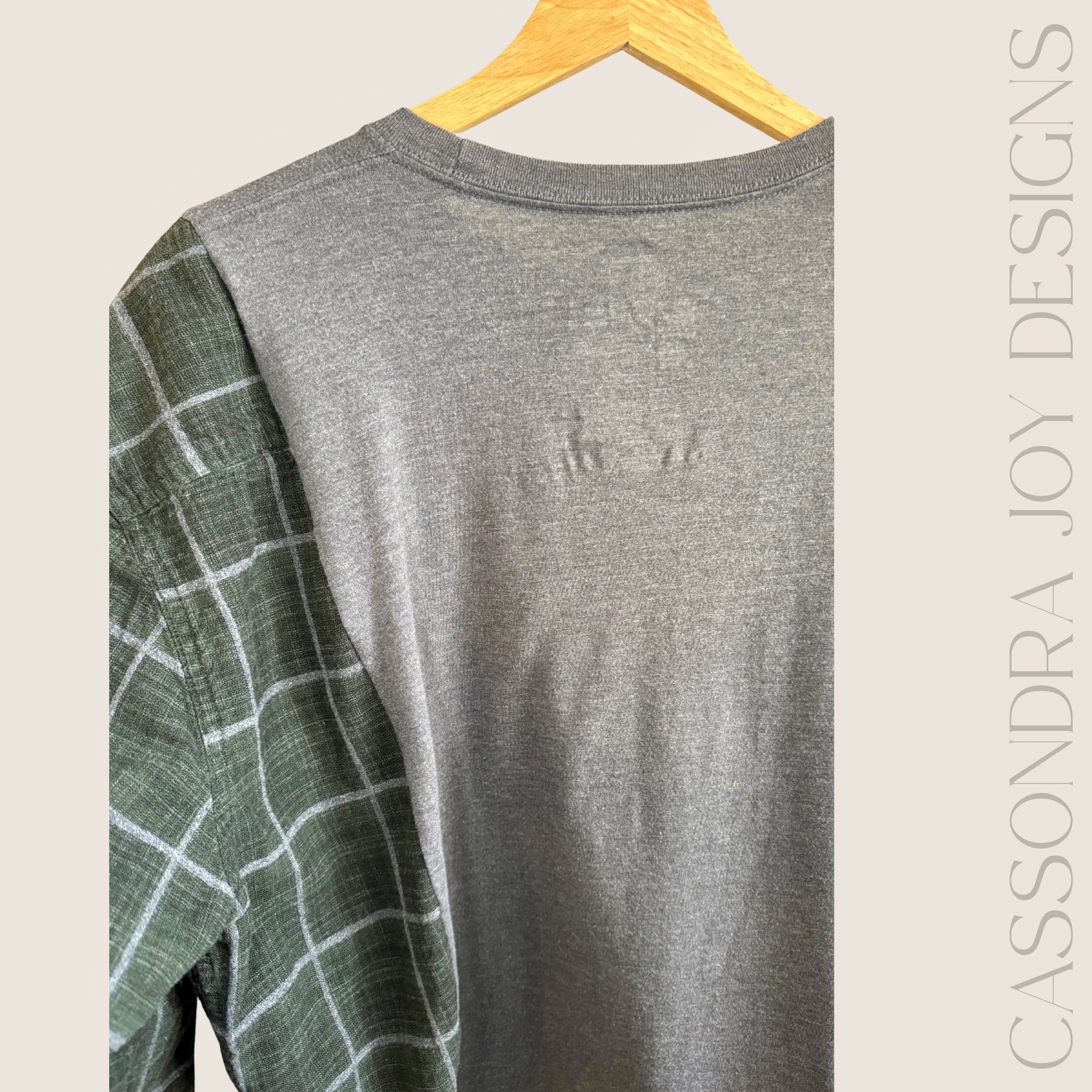 The Midnight Flight Rework transforms a soft, Majestic brand shirt with a forest green and grey flannel, with an added patch on the sleeve. The result is a relaxed, statement piece that blends vintage character with modern design. Each stitch is thoughtfully placed to give a new life to existing materials - making it as sustainable as it is unique.
